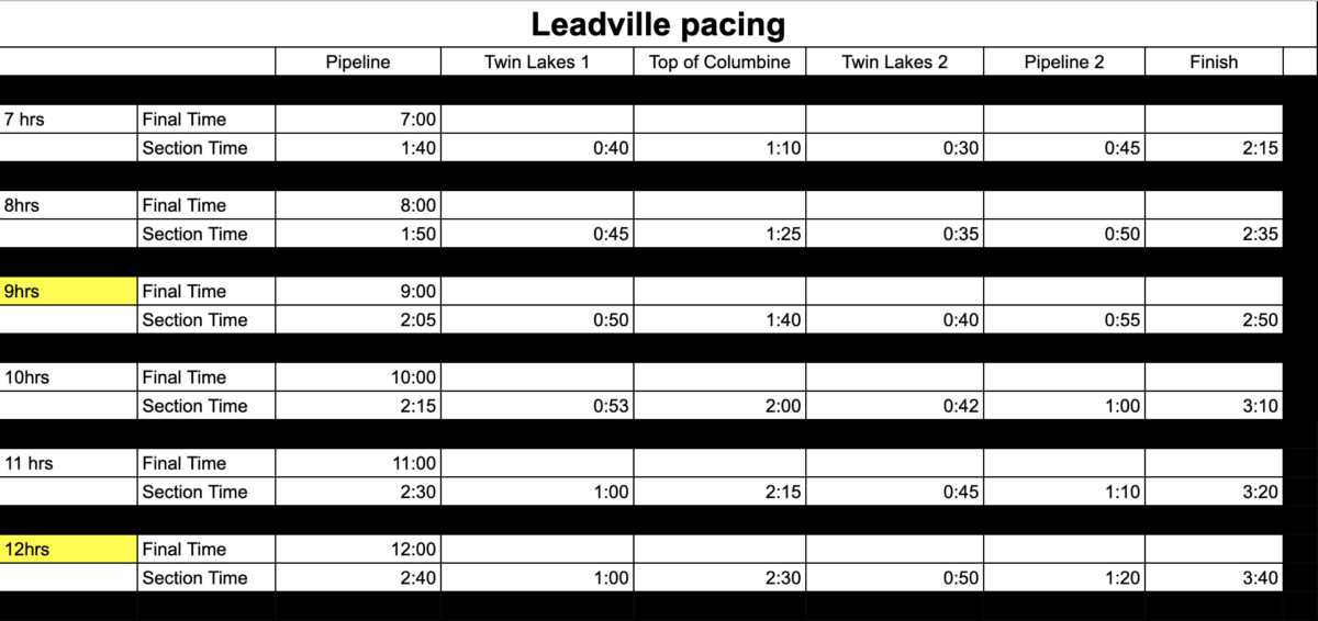 I used this to compile results from selected participants over the past few years. I started coaching Leadville athletes in 2002 and had already amassed quite a bit of data. I looked at the winning times, the times for sub 9hrs, the times for sub 10hrs, 11hrs, and 12hrs. You can see some of this data below and do understand that these are averages. I have seen some riders miss goal times in the beginning and make up time in other portions of the event. We all have our own strengths and lots of variables can take place during the event. Contact me if you would like a copy of this spreadsheet to plug in some numbers of your own to estimate your finishing time.